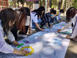 活动面向9728太阳集团全体学生,活动地点为体育场西侧路边,参与活动的同学在活动处领取一只涂鸦笔,在工作人员提前绘制好的画布上进行填色,并签名留念。活动现场共幅画布,一幅是同学们自主涂鸦写有“推动绿色发展,促进人与自然和谐共生”的画布,表达同学们对共建美好环境的憧憬与向往。另一幅是由同学们共同绘制的寓意美好生活的图画,蓝天白云青山绿水,表现人与自然和谐共生的幸福画面。