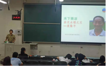 杨明峰老师以“禾下乘凉”为主题,从杂交水稻之父-袁隆平先生的家庭,才艺,梦想,艰辛历程等方面,多角度,全方位的展现了袁隆平先生是如何树立让人们摆脱饥饿的理想,如何在艰难探索中研发出杂交水稻,让数以亿计的人民都能吃饱饭。袁隆平先生有两个梦,“一个是禾下乘凉的梦,二是杂交水稻覆盖全球的梦”。袁隆平先生一生致力于杂交水稻技术的研究、应用与推广,不畏艰难,甘于奉献,呕心沥血,苦苦追求,为解决中国人的吃饭问题做出了重大贡献。先生的杰出成就不仅属于中国,而且影响世界。我们应该学习他献身科学、顽强拼搏、勇于创新的高尚品德,学习他的那种科技创新精神,服务国家,造福社会。