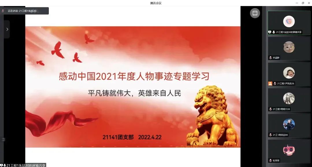 此次团日活动由团支书潘悦同学主持,团日主题的为“平凡铸就伟大,英雄来自人民”。会议共分为三部分,《感动中国》节目的介绍、《感动中国》年度人物和《感动中国》的内涵。首先团支书用文字材料向同学们介绍了《感动中国》节目的相关信息,以及“《感动中国》年度人物推选标准” ,借此让同学们了解这个节目的背景,认识什么是“《感动中国》的人物”。然后通过视频材料带领同学们回顾了从2002年节目首次推出到2021年所有的年度人物。视频中的每一个人物都让同学们燃起敬佩之心。最后团支书向同学们讲解了《感动中国》的内涵,希望同学们每个人今后都能学习他们的品质,为祖国发光发热。