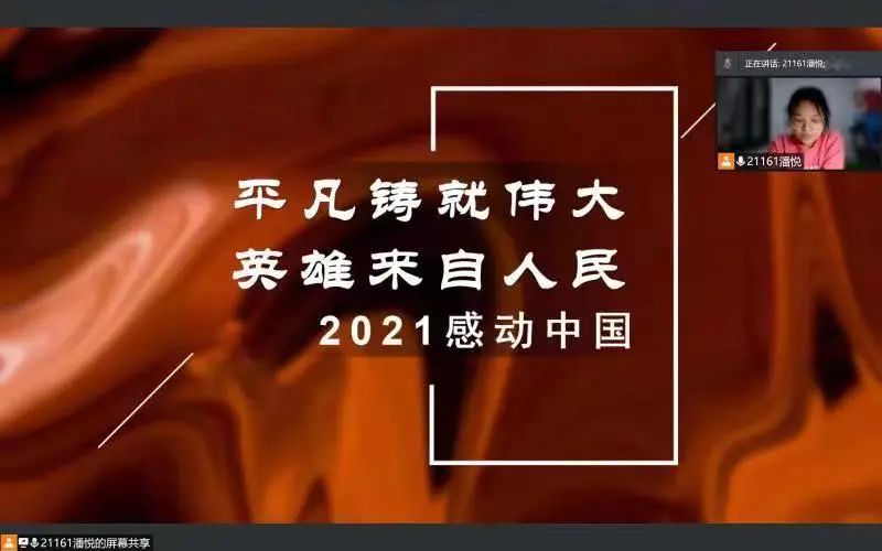 然后会议主持人介绍了《感动中国》2021年度人物的相关故事。通过组织学习,同学们要以十大人物为榜样,学习他们拼搏奋斗、勇担使命的崇高品质,同时也进一步坚定了同学们的理想信念,对今后更好地开展学习工作起到激励作用。