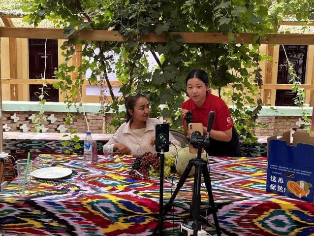 “家里的葡萄熟了,希望大家能来新疆尝尝”——葡萄镇村民说道。葡萄产业是吐鲁番地区的成为富民产业,是乡亲们口中的“甜蜜事业”,是当地推动文化和旅游深度融合的纽带,更是吐鲁番自带流量的金名片。7月29日,实践团来到吐鲁番高昌区葡萄镇丝绸之路民宿,服务2023年吐鲁番葡萄采摘季开园仪式——葡萄采摘派对,搭建舞台、布置场地、向游客介绍20余种葡萄品种......忙的不亦乐乎,虽然满脸汗水,但笑意盎然。仪式结束后,实践团成员走进葡萄售卖直播间化身带货主播,将吐鲁番人民的热情和甜美的葡萄推广给全国人民,以实际行动助力村民增收和葡萄产业发展。