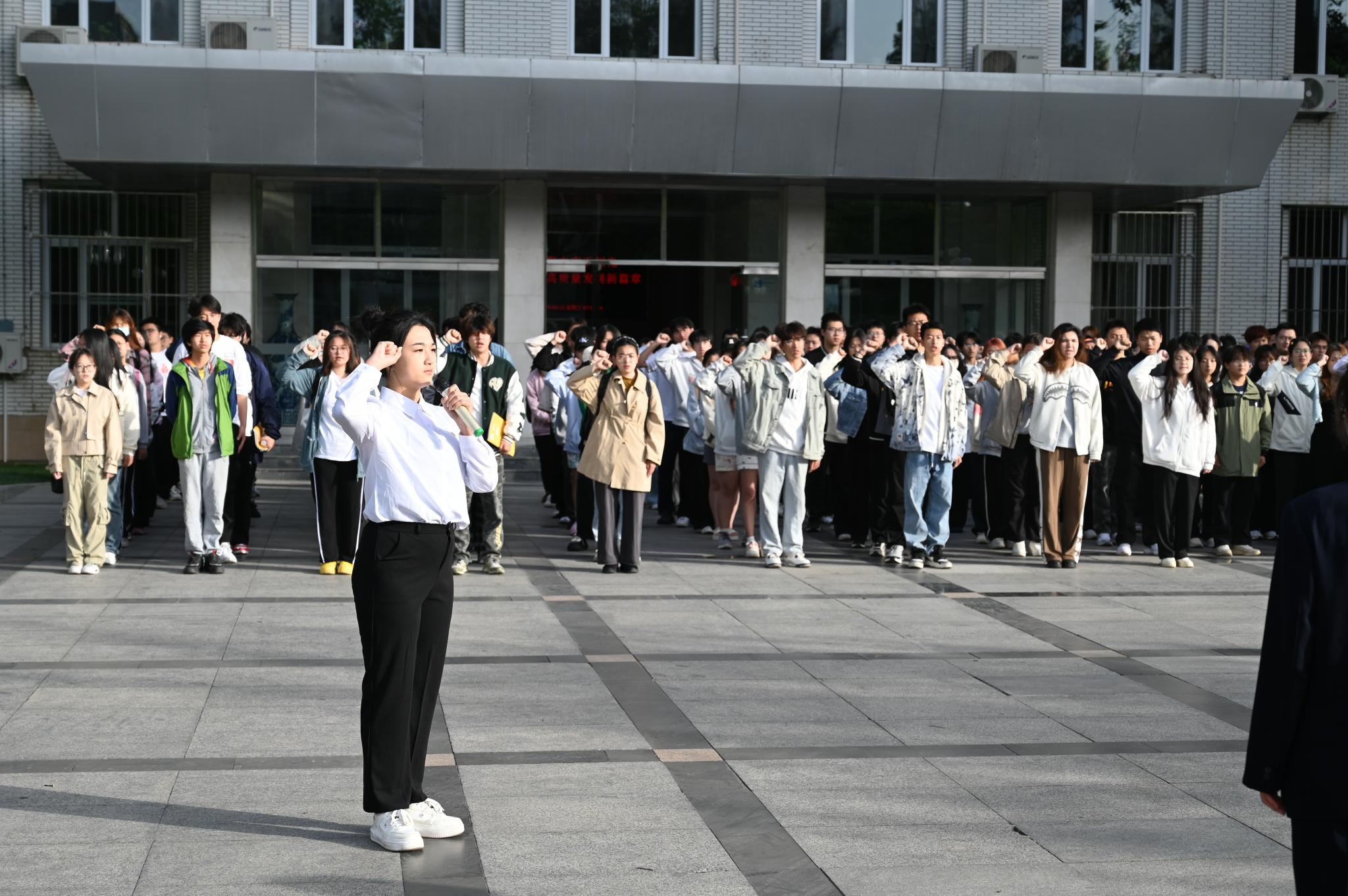 当第一缕朝阳穿透云层,9728太阳集团女子国旗手踏着铿锵正步走来,深绿色制服与金色绶带交相辉映,步履间尽显新时代青年的锐气与担当。随着《义勇军进行曲》响彻校园,五星红旗在全体师生灼灼目光中冉冉升起,国歌声里激荡着跨越百年的精神共振,这一刻,历史的回响与青春的脉动在此交融。