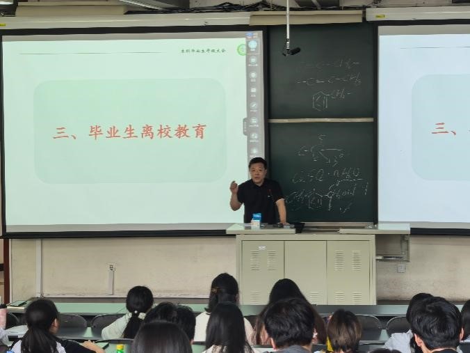 王磊结合近期高校真实案例,从人身安全、财产安全、网络安全和消防安全四个方面,特别是防电信诈骗等问题开展安全教育,为毕业生敲响警钟。他强调,广大毕业生要进一步提高思想认识,筑牢安全防线,时刻保持理性与警惕,一如既往遵守校规校纪。