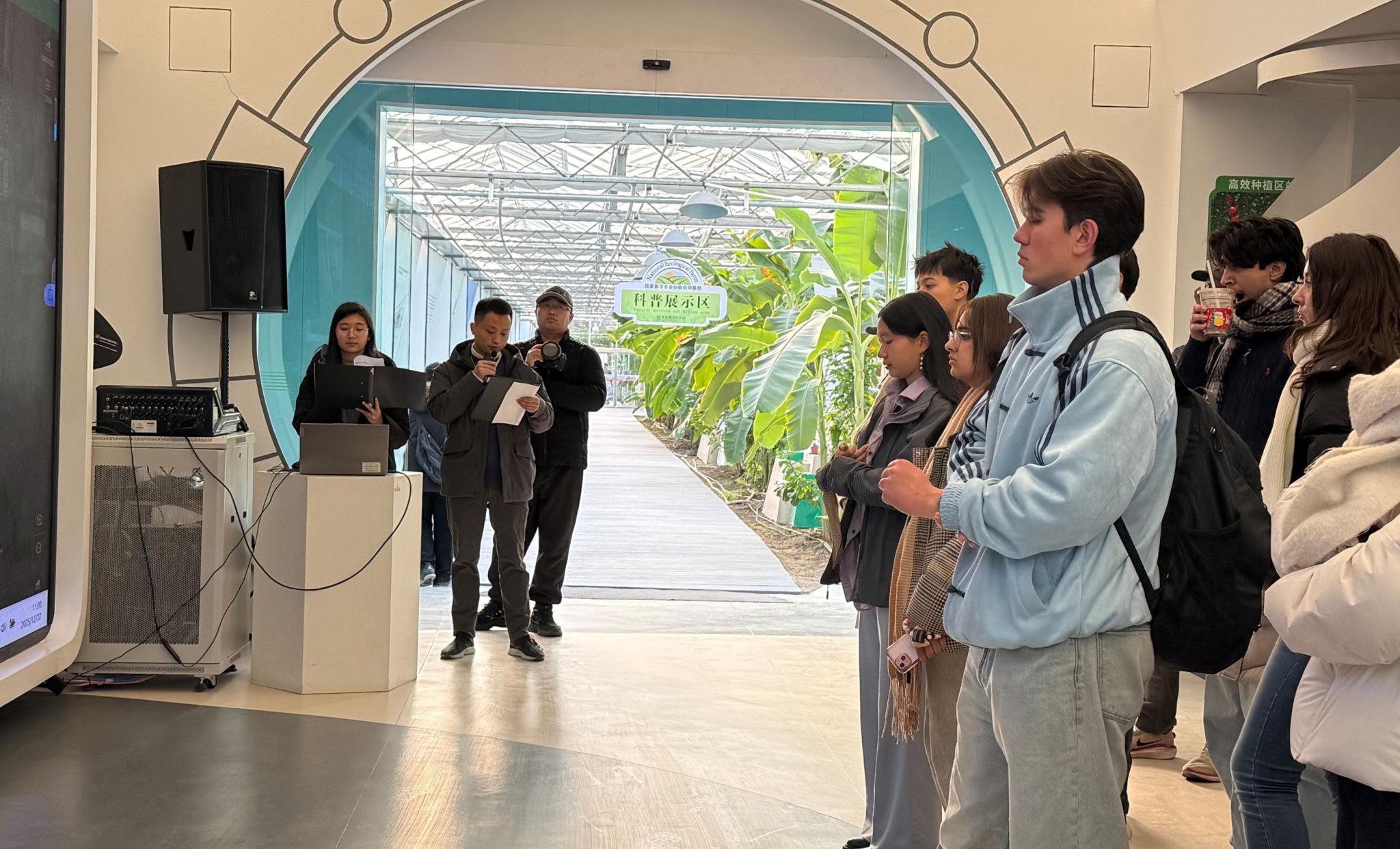 在科普大厅,来访留学生们首先了解了朝来农艺园的整体规划、功能布局及数字农业平台建设情况,对智慧农业在生产管理、环境调控和数据应用中的作用形成了直观认识。随后,参观团队走进科普展示区,重点了解空中草莓种植模式、农艺园的发展历程,以及朝阳区其他农业示范园区建设成果,并现场观摩温室内智能环控设备的运行情况。
