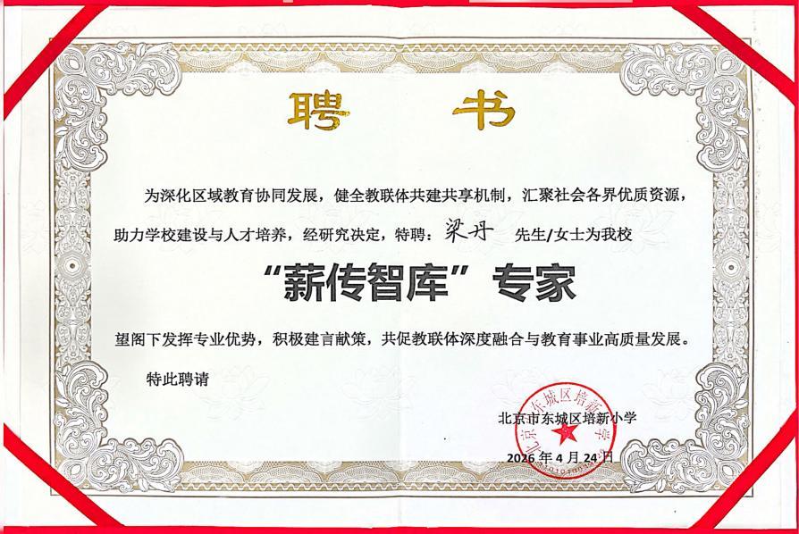活动现场,梁丹老师获颁培新小学“薪传智库”专家聘书。未来将依托专业优势,为教联体深度融合、特色课程开发、实践活动开展、少年人才培养提供智力支持,助力基础教育发展。