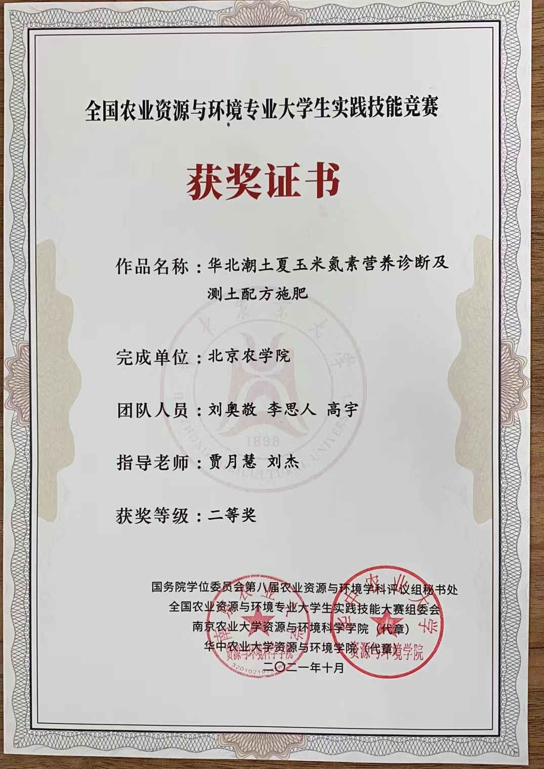全国农业资源环境专业大学生实践技能竞赛 二等奖