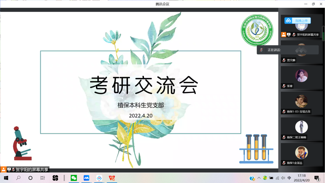 太阳成集团tyc9728植物保护本科生党支部于2022年4月20日召开了考研分享大会,会议上邀请了考研、考公上岸的同学们分享了自己的经验。