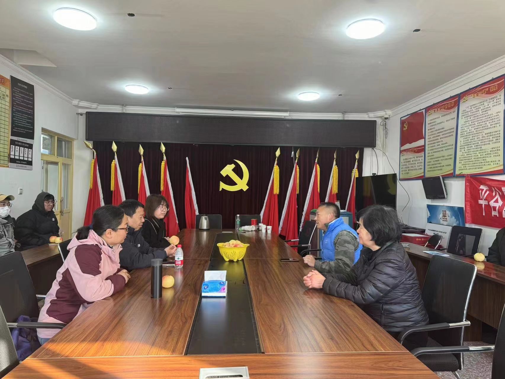 茅山后村党支部书记马小勇介绍了茅山后村的基本情况,茅山后村特产佛见喜梨,具有二百多年栽培历史,依托该村特有的栽培环境,佛见喜梨风味独特,口感脆而多汁,果肉细腻,酸甜适口,同时也面临着但抗虫力差,销路不畅等问题。双方就支部共建、施用菌肥以及利用天敌防治等绿色防控、拓宽科技小院农产品销售渠道,增强消费者对产业信任,通过“电商+直播带货”、开辟绿色通道等方式等基本情况进行交流。