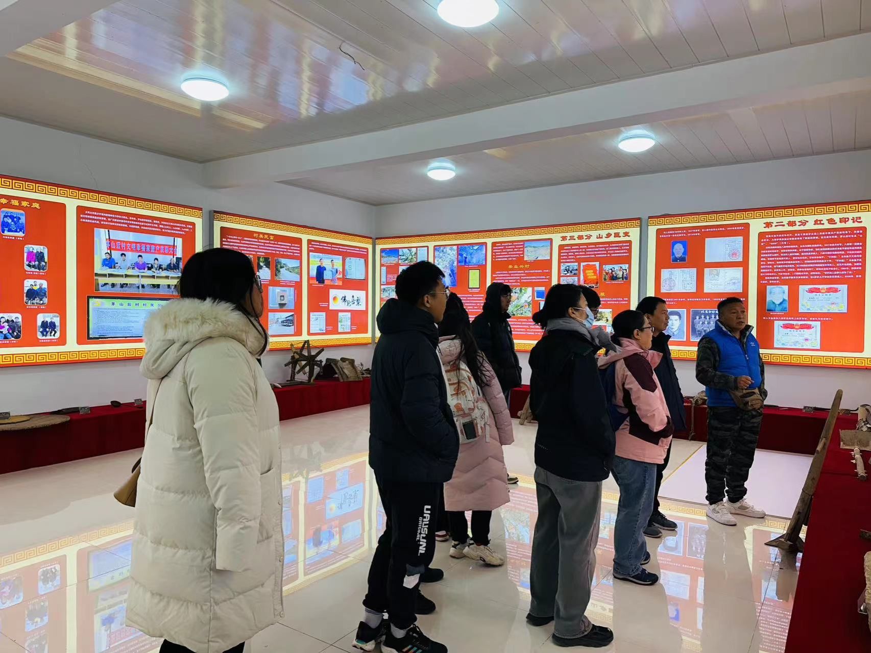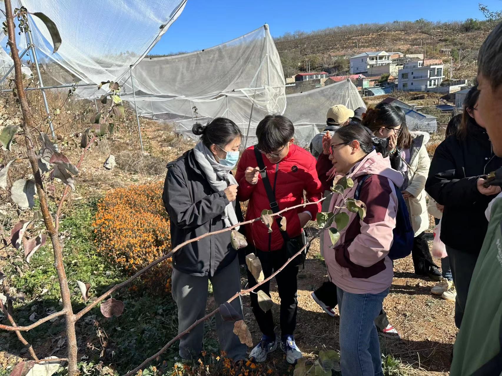 座谈交流后,一行人前往茅山后乡情村史陈列室,了解了茅山后村的历史和发展,感悟茅山后村村民团结合作、自立自强的宝贵精神。随后一行人前往佛见喜”梨病虫害绿色防控与专业化管理“博士农场”实地学习交流。在参观过程中,马小勇介绍了博士农场与科技小院建设进展,在任争光老师的带领下组建科研团队,带领学生党员驻扎茅山后村,助力该村发展,不仅促进了当地产业发展,也提升了农民生活的获得感和幸福感。