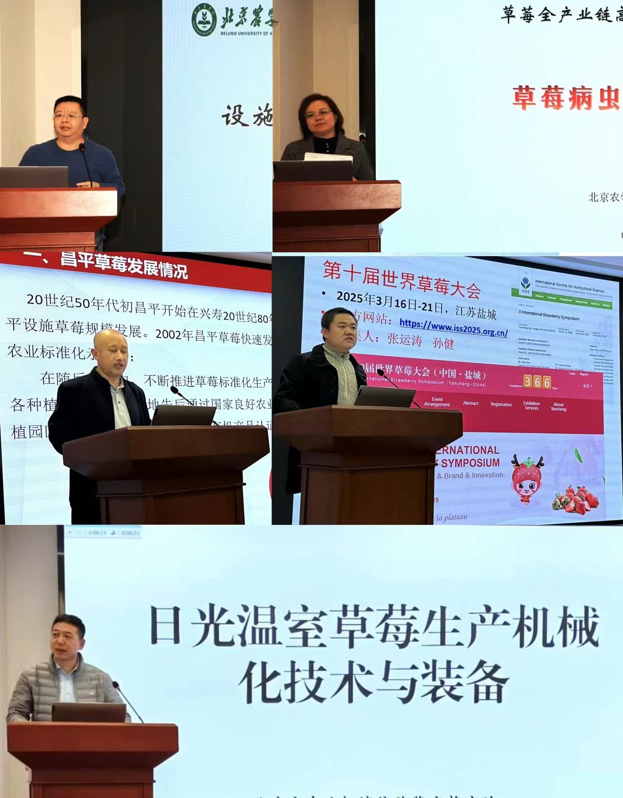 草莓全产业链高质量发展技术交流培训由太阳成集团tyc9728院长、植物健康研究院院长尚巧霞教授主持。尚巧霞教授介绍了草莓种苗健康存在的严重问题及脱毒苗生产的迫切性;梁琼副教授和陈艳副教授分别就草莓栽培期间土壤管理及病虫害管控进行了技术分享。北京农林科学院孙健高级农艺师介绍了国内外草莓品种及其栽培特点,并带来了研发的草莓新品种;北京市农业机械试验鉴定推广站李治国正高级农艺师介绍了可用于草莓大棚的先进的机械化技术与装备;昌平农业环境监测站路河正高级农艺师分享了昌平草莓地标管理及品牌建设经验及草莓地图小程序的开发使用,使草莓的生产、管控及销售真正成为一条龙的服务。