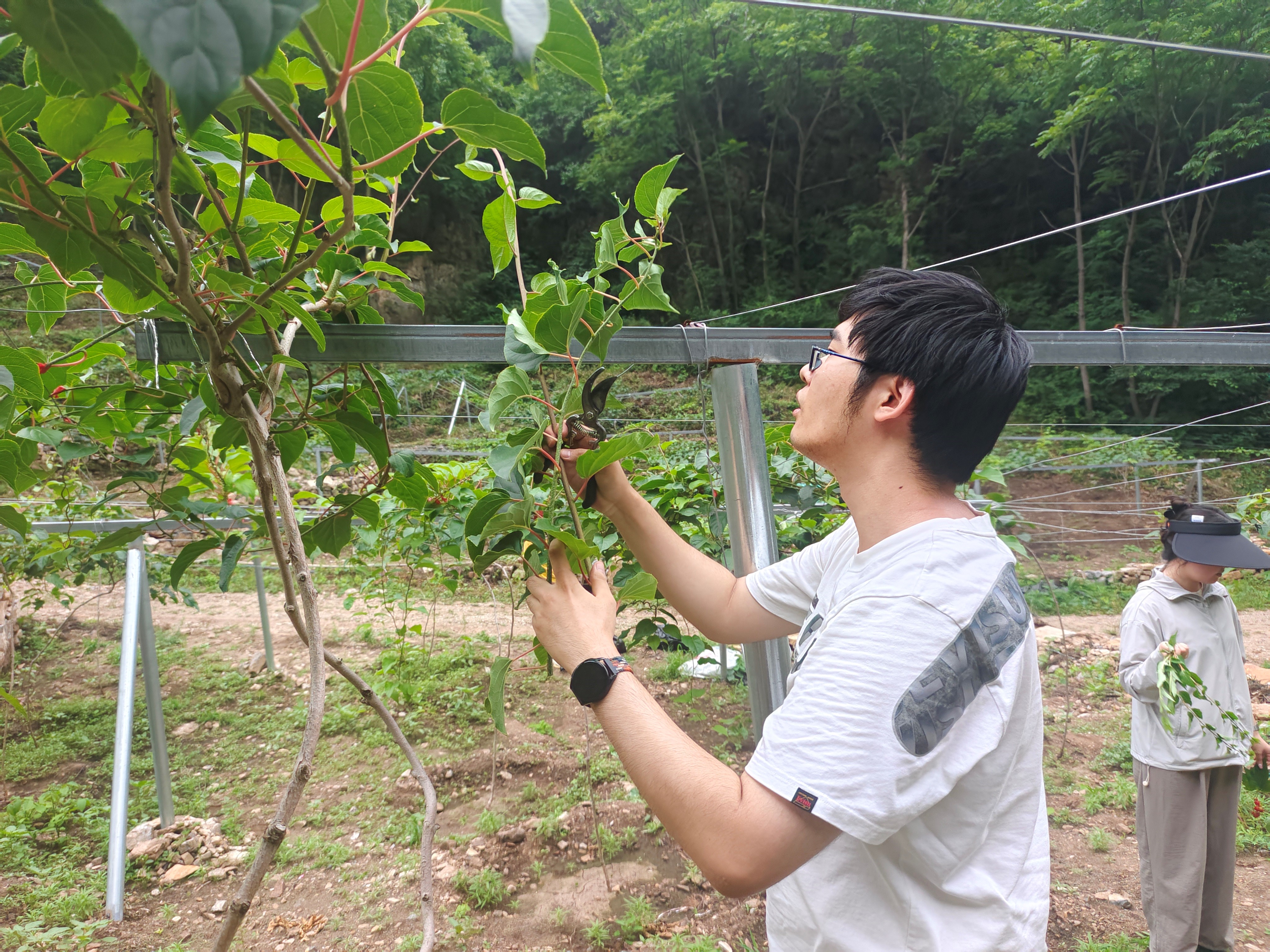 在软枣猕猴桃园,团队指导老师与成员们凭借丰富的专业知识,为果农们详细讲解了枝条牵引、果架搭建、枝蔓修剪、水肥管理以及虫害预防等关键的猕猴桃栽培和管理技术。并与果农进行了深入的交流,针对实际生产中遇到的疑难问题提出了切实可行的建议与解决方案。