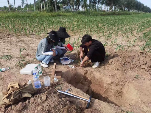 应南皮县盐碱地改良的技术需求,石生伟老师带领研究生和实习的本科生,通过现场挖剖面,诊断土壤障碍因素,采集土壤样品。在全面分析土壤属性和障碍因素的基础上,将为开展土壤改良的施工企业编写土壤改良和整治技术方案。