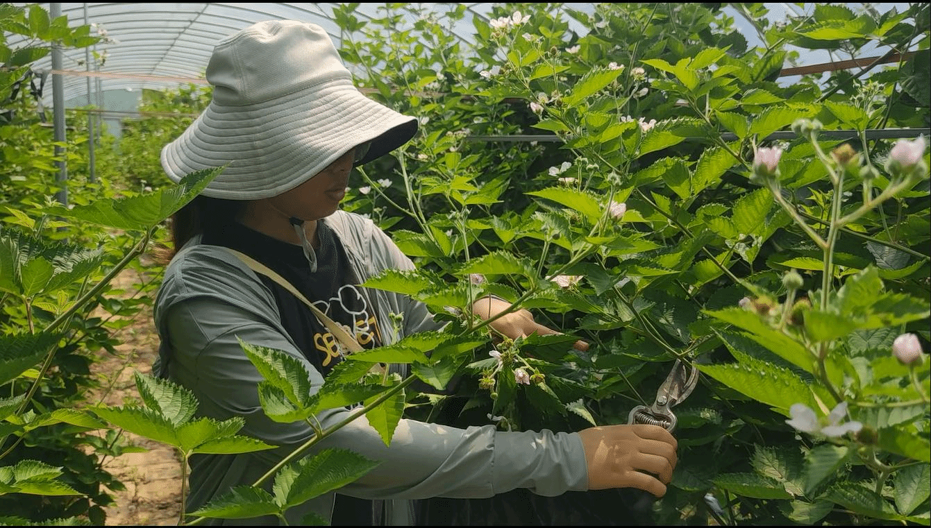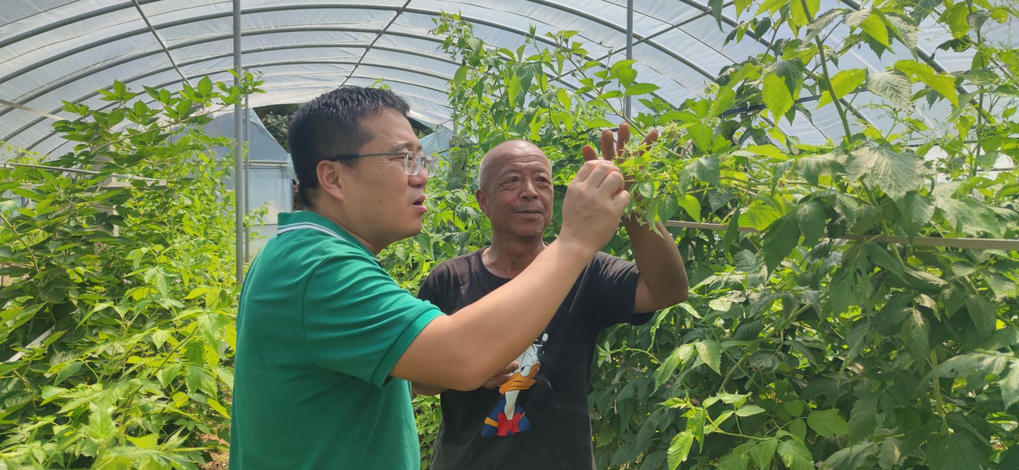 沿着曲折蜿蜒的山间小径,穿过生机盎然的玉米地,一个个挤满翠绿枝条的大棚映入眼帘。在树莓种植大棚中,实践团师生详细产看了树莓各品种的生长情况,实践团队记录了大棚中树莓植株存在的健康问题并为树莓的绿色栽培提出了建议。随后实践团师生采集了果枝、花枝、叶片等基地当前主栽的树莓品种实验材料,为后续开展不同树莓品种遗传多样性分析及新品种选育提供支撑。此外,双方还就树莓种植与管理的相关事项进行了深入交流,实践团还结合当地具体情况和问题对树莓的生产提出了改善建议,提振了农户发展特色小浆果产业的信心。