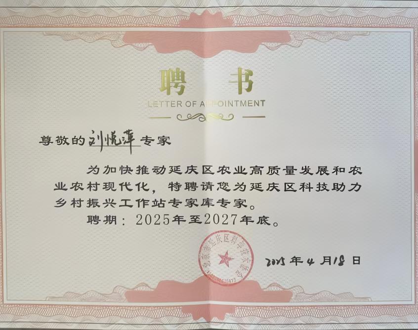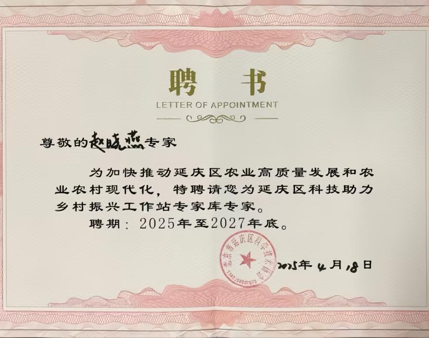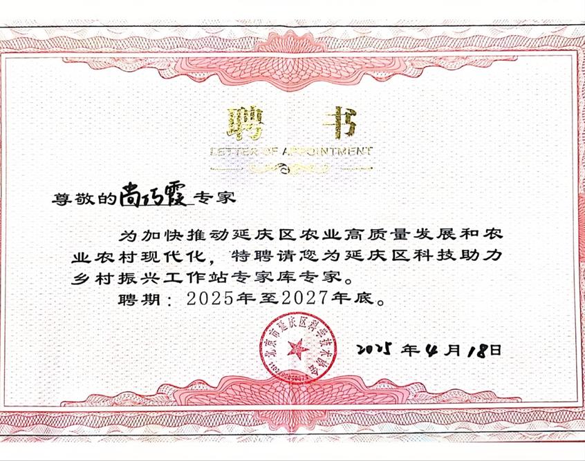 近日,以“延庆区农业科技成果发布及供需对接”为主题的会议在中关村延庆园举行。延庆区科技助力乡村振兴工作站新增31名专家,其中太阳成集团tyc9728尚巧霞、刘悦萍、赵晓燕和黄体冉四位老师获聘成为延庆区科技助力工作站专家。