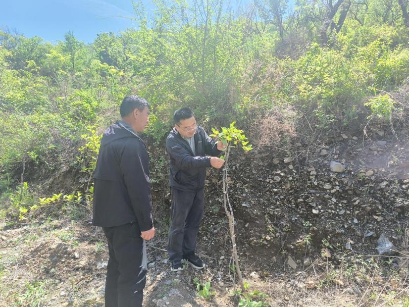 田间地头,师生们与农户一起挥锹挖坑、栽苗培土。研究生一边劳作一边与农户交流:"大叔,您看这个根系使他舒展一点放,坑再浅一点,成活率会更高。"研究生们一边栽苗,一边讲解栽培要点。"这些大学生干活踏实,讲的技术也清楚。"水头村焦书记竖起了大拇指。
